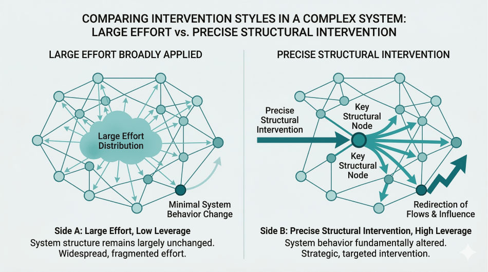 A small structural intervention placed at a point of coordination or constraint can redirect the behavior of many interacting components simultaneously.