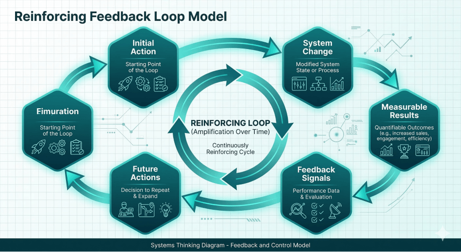 The Reinforcing Feedback Loop Model illustrates how certain system behaviors amplify themselves over time. In many systems, the results produced by an action influence future actions in ways that strengthen the original pattern. When this occurs, the system enters a reinforcing loop where change builds upon itself.