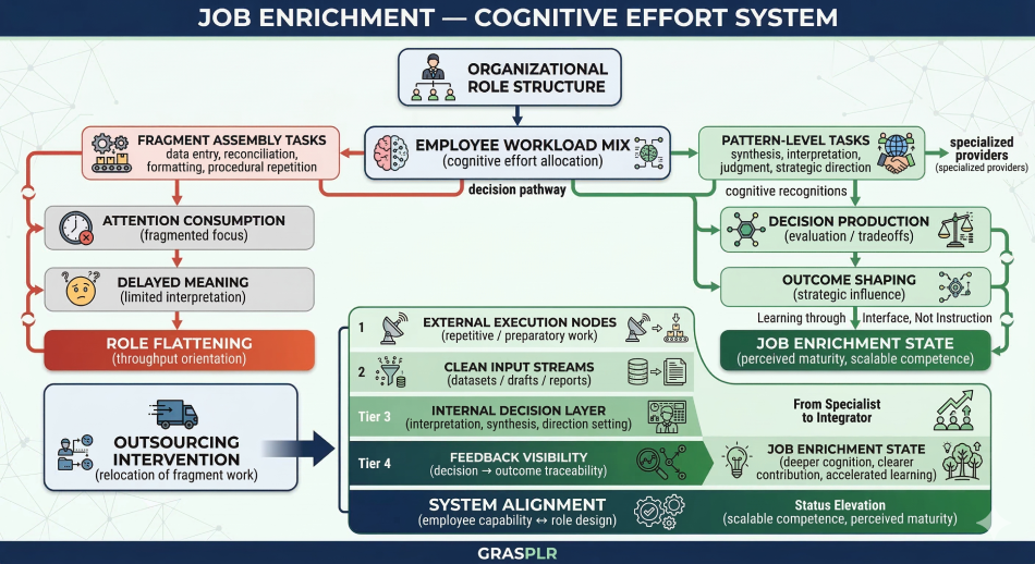 Roles are enriched when they concentrate judgment, responsibility, and learning while minimizing unnecessary fragmentation. Outsourcing contributes by relocating repetitive and preparatory work to parts of the system better suited to handle it.