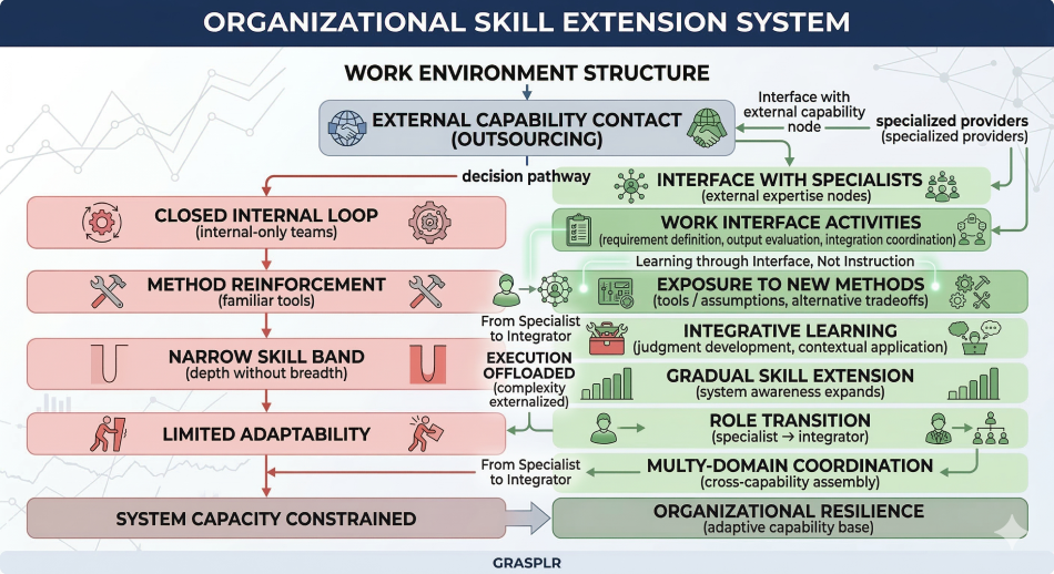 Outsourcing mitigates this by offloading execution while exposing employees to new domains at the coordination level. They do not need to master every detail immediately. Instead, they observe, question, and selectively internalize what is useful.